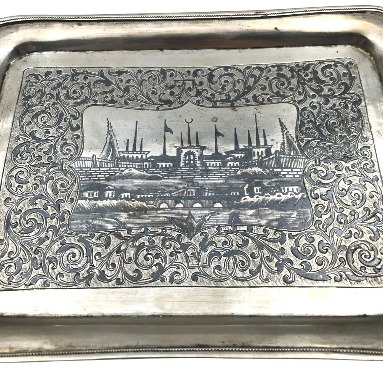 Rus Çarlık Dönemi 1863 Tarih ve 84 Ayar Damgalı Osmanlı Sancak Temalı Mükemmel Kondisyonda Tepsi